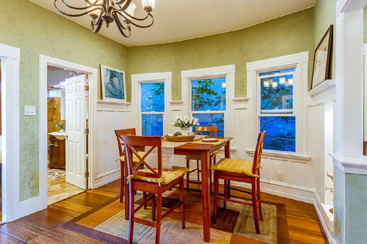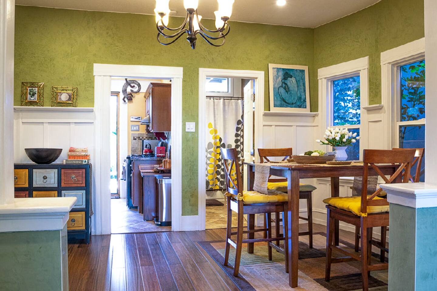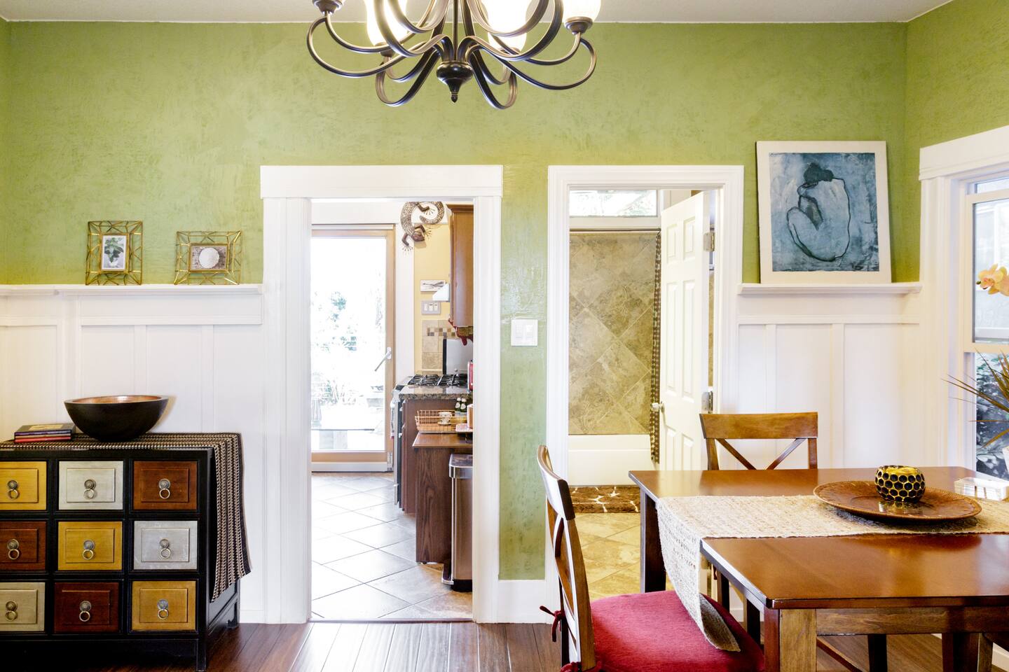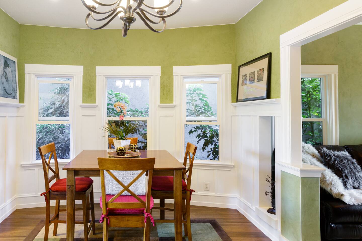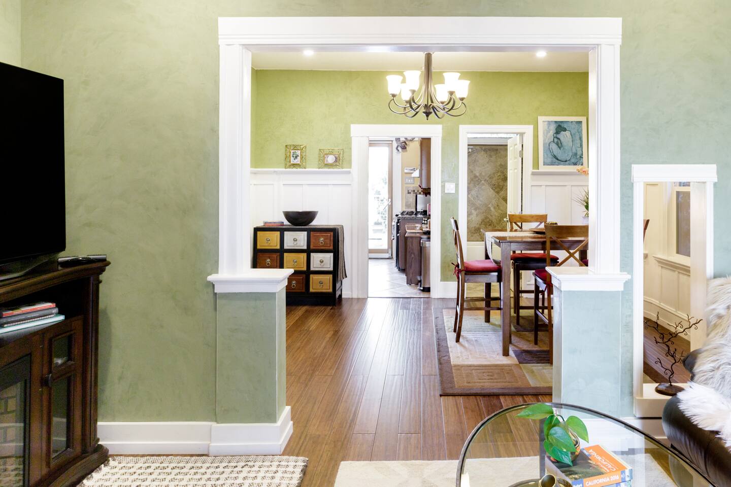 🌿 Charming 1910 Craftsman Guest Suite with Private Entrance & Water Lily Koi Fish Pond 🌿 …Since the thing perhaps is to eat flowers and not to be afraid. - e.e. cummings Step into our beautifully updated 115-year-old California Craftsman Guest Suite, where historic charm meets modern elegance. Nestled on a serene, tree-lined street with FREE street parking, this urban oasis blends traditional and contemporary design with natural materials like reclaimed redwood and natural stone. The spacious one-bedroom suite features a QUEEN bed, formal dining room, bay window nook, and a remodeled bathroom with a shower-over-tub. Enjoy brand-new hardwood floors with hydronic radiant heating, Venetian plaster walls, and original wainscotting. Relax in the living room under a Swarovski crystal chandelier, with a 65” Samsung 3D Smart TV, reclining leather sofa, and large electric fireplace. Outside, unwind on your private terrace overlooking a tranquil koi pond with water lilies, surrounded by palm trees, bougainvillea, lemon trees, and hummingbirds. The private entrance and outdoor seating area enhance your peaceful retreat. Stepping into comfort, this spacious apartment boasts a sophisticated living space, blending warmth and style. Soft light filters through the windows, illuminating a living room designed for relaxation. Beyond the ordinary, this craftsman-style one-bedroom flat offers more than just a place to stay; it's an experience. The koi pond and lush yard beckons and is just the beginning. Located across from the Emeryville Center of Community Life, with a community pool and running track, this Craftsman gem offers easy access to local amenities. Experience history, serenity, and modern comfort in one unforgettable stay. One big advantage we have is: Easy and FREE street Parking 🅿️ on our tree-lined street. #modern #peaceful #craftsman #urbanoasis #garden #koifishpond #tropicalgardens 🌿 MAX OCCUPANCY: 2 people at all times! 🌿 OUR GUESTS: Perfect for single professionals, business travelers, UC Berkeley visitors, guest professors, visiting families of young professionals who work in Emeryville, San Francisco visitors. It comfortably sleeps 2 people, great for couples! Our guests are kind, friendly, self-sufficient, easy - going and lovely folks ONLY who understand the home-sharing ideas and values! AMENITIES 🌿: ~ Queen bed with a luxury pillow mattress ~ Hardwood bamboo floor - hydronic radiant heat in every room ( green and allergy, asthma friendly) ~ Stainless steel refrigerator ~ Maytag oven ~ FREE Wireless Internet ~ 65' LED 3D SAMSUNG TV ~ electric fireplace with a remote ~ cable TV, premium channels Discovery, Science, HBO, movies, NEWS, etc. ~ Apple TV ~ gas stove ~ well-stocked kitchen, equipped with utensils, glasses, cups, etc. ~ Nespresso machine ~ cotton linens provided ~ cotton towels provided ~ WASHER and DRYER downstairs in the back of the house ~ FREE STREET PARKING Your HOSTS: We are a friendly, quiet and considerate couple - landscape architect/designer ( Nikolay ) and a psychologist ( Albena ). We are both born and raised in Europe. We've built our dream house here in San Francisco Bay! We love hosting the world in it! LOCATION: Strategic central location - close to anywhere in the Bay area. Emeryville is just across the BAY BRIDGE from San Francisco. It's an easy commute to downtown San Francisco, Berkeley, Oakland and moments away from public transit, Emeryville Marina and bay side nature trails. It's located in the heart of Emeryville, close to highways, shops, local restaurants, and groceries; ~ walking distance to animation studio Pixar, Novartis, LeapFrog, Stanford Health Care Outpatient Clinic, Bullseye Glass Gallery, Survey Monkey, Imperfect Produce and numbers of Emeryville local businesses; ~ 10 - 25 min drive to downtown San Francisco ( depending on the traffic) IMPORTANT: Bay Bridge requires one way Toll to the city; ~ 10 min drive to Berkeley and Oakland; ~ 40- 50 min drive to San Francisco International Airport; Napa; Silicon Valley ~ FREE SHUTTLE to BART ( Metro ) and groceries With easy FREE street PARKING! WALK SCORE: 84 very walkable ( out of 100 ) BiKE SCORE: 72 ( out of 100 ) OUR VISION: • We have tried to design a GREEN, beautiful and fully FUNCTIONAL space for a comfortable, modern, SOCIALLY RESPONSIBLE living while preserving all the original floor plan and details!. THANK YOU for assisting us in keeping it that way by: • conserving energy and resources • treating your hosts, our neighbors and our property with respect