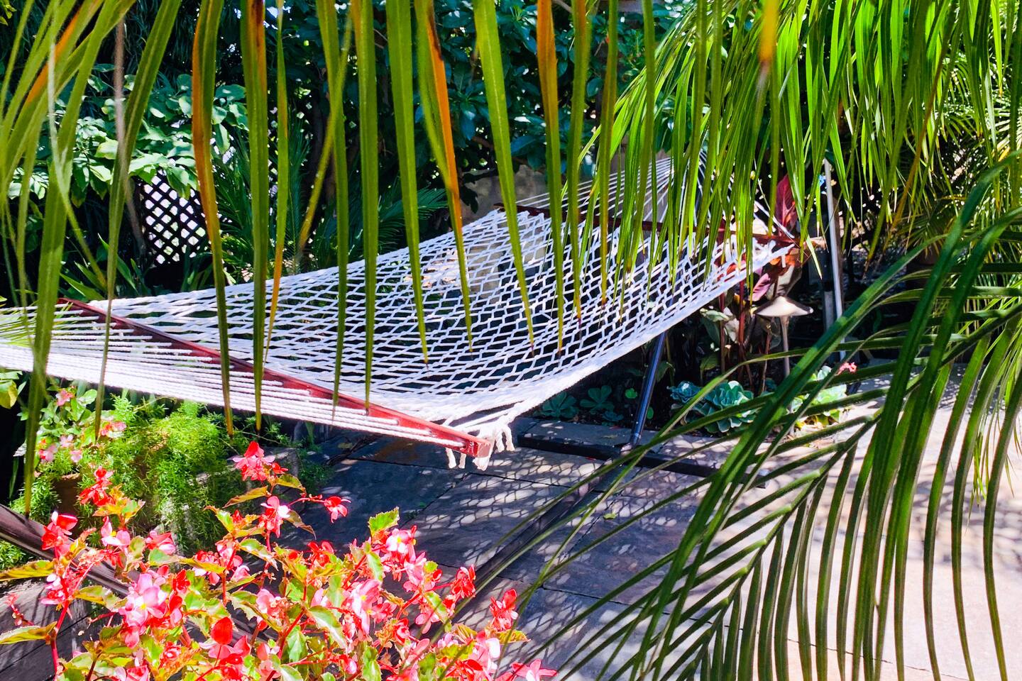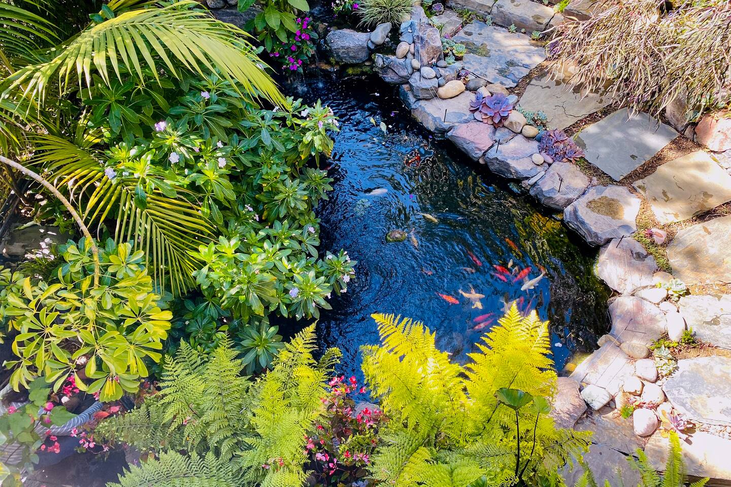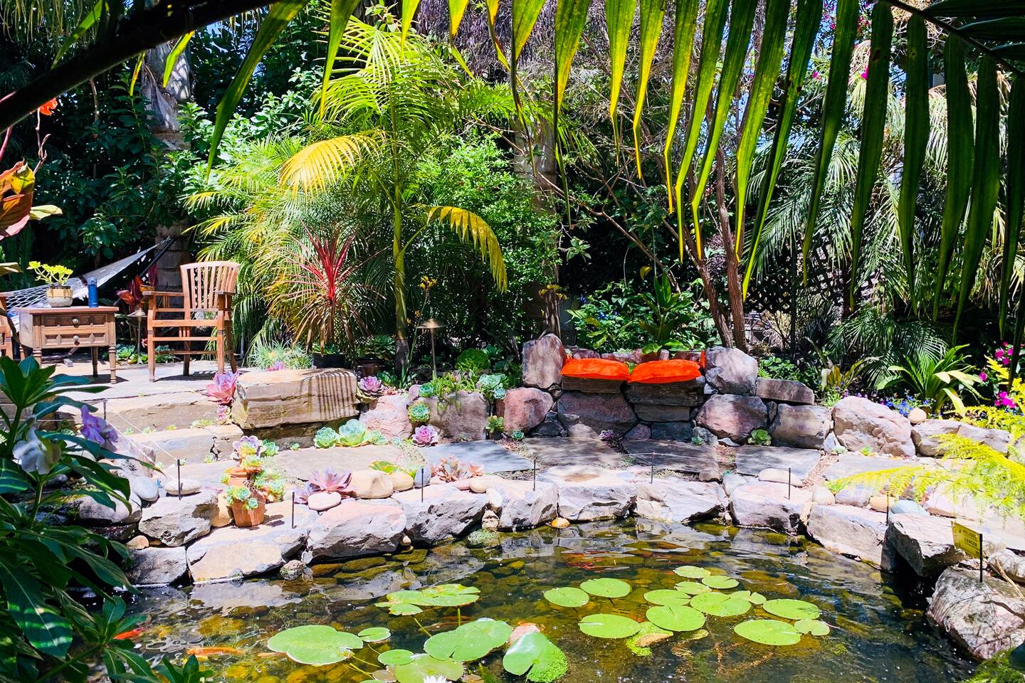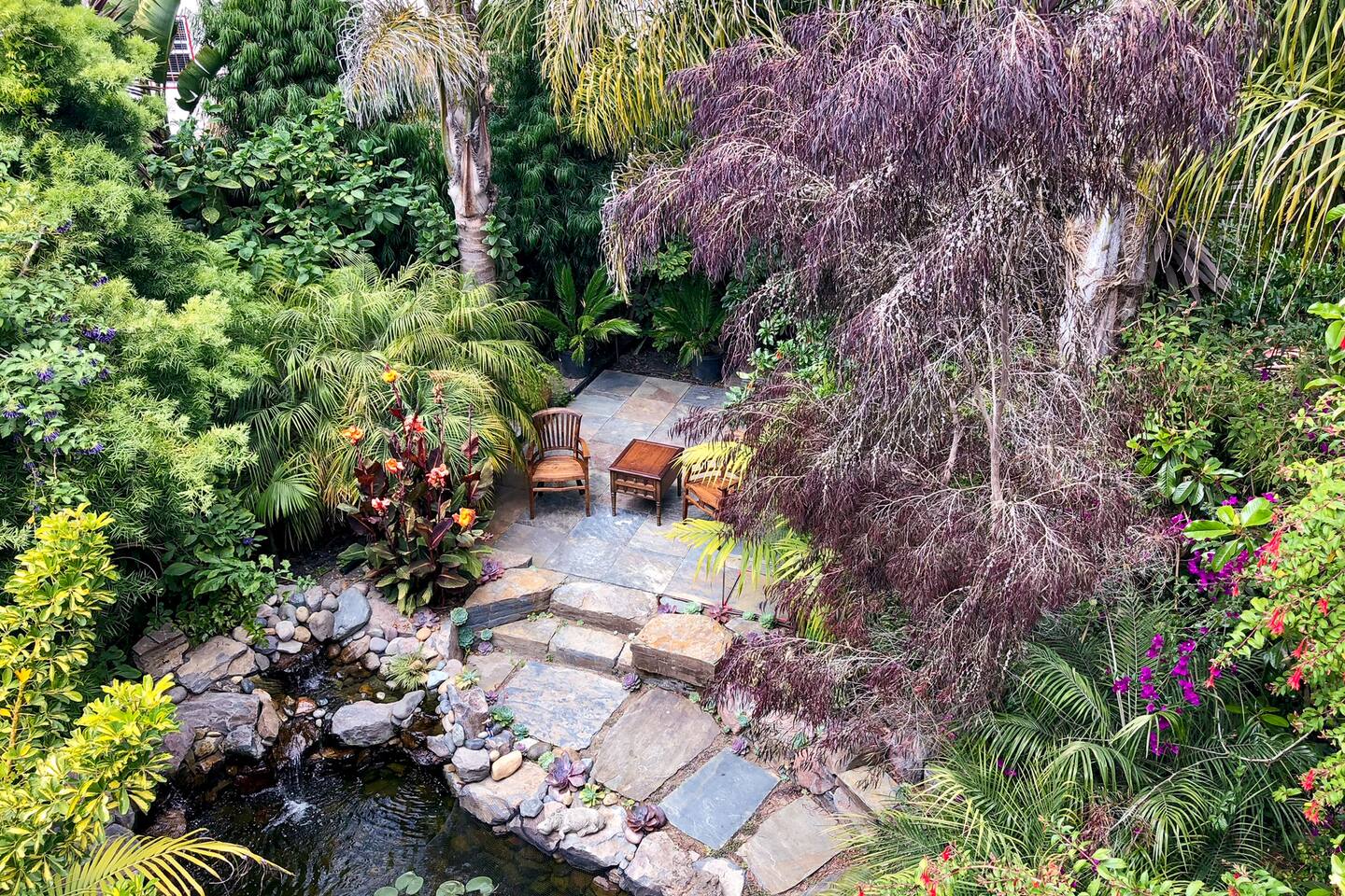 Access to: ~ 1 bedroom with a brand new luxury QUEEN mattress with 100% cotton bedding ~ full kitchen with a gas range, Samsung refrigerator and Illy pods espresso machine *** NOTE: NO dishwasher ~ bathroom with a shower over a tub ~ formal dining room with wooden dining table and chairs ~ living room with 65" Samsung 3D Smart TV ~ Apple TV ~ front porch with seating area ~ big back terrace overlooking lush tropical gardens and our koi fish pond with water lilies ~ washer and dryer 🦋 NOTE: stairs involved 🦋 THANK YOU!