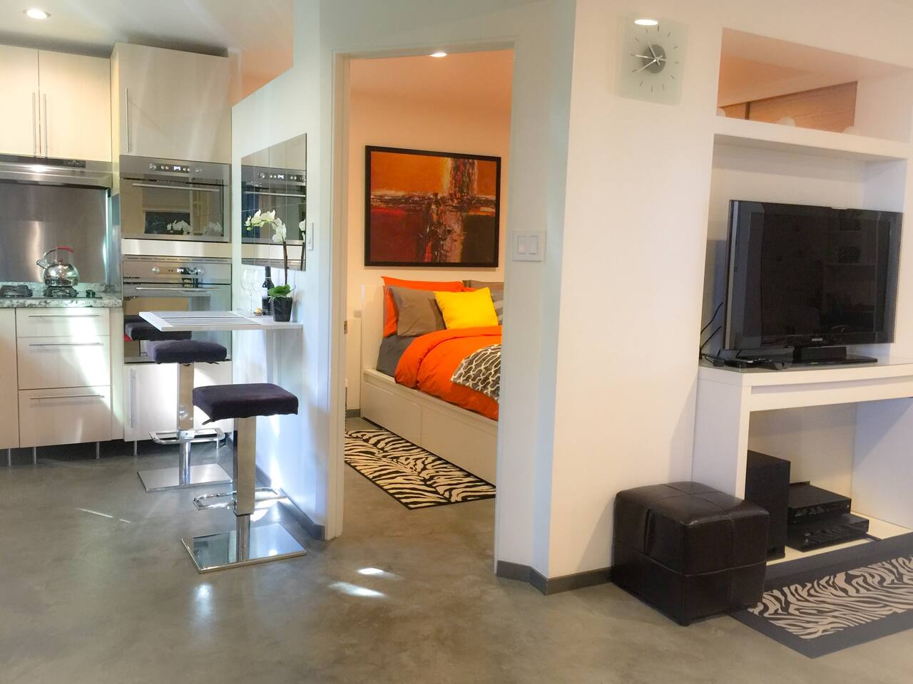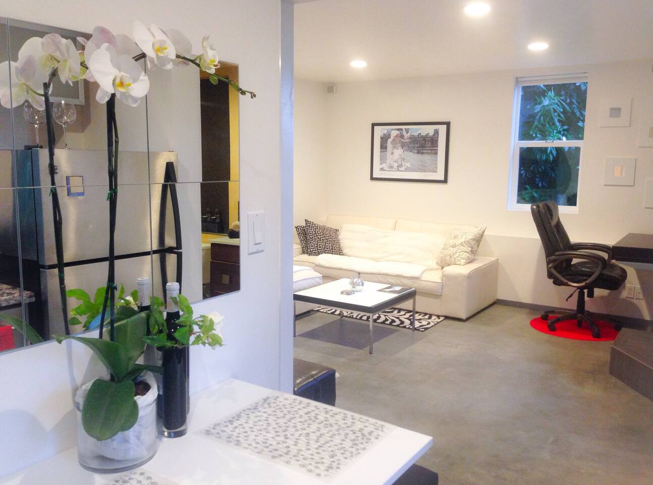 🌿🌿🌿 Our Garden Guest Suite is a comfortable, minimalist 1 bedroom with a separate, private entrance. It has a plenty of closet space, full kitchen with a living room and is designed with comfort, functionality and minimum impact in mind. Sleek, modern, and perfectly sized. This compact flat maximizes every inch with stylish design; open concept living at its finest. The seamless flow between kitchen, bedroom, and living areas is both functional and visually appealing. Minimalist elegance and a cozy sanctuary. There is also a koi pond with a waterfall out back, with a lush garden. It’s perfect for business travelers, visiting UC Berkeley professors, visiting couples. Max occupancy 2 people at all times. It's a private GROUND level unit in our 1910 California Craftsman. It is a 2-steps down Garden Guest Suite wrapped in lush greenery, sporting radiant heated polished cement floors. With its clean lines, The Minimalist offers a contemporary atmosphere with the serenity of an urban oasis. With its sunken excavation design - it provides both privacy from the street side and maximizes the insulative natural geo-thermo properties of Mother Earth. It helps with keeping the apartment warm in winter and cool in the summer, eliminating the need for an AC, thus minimizing its environmental impact. In addition utilizes hydronic radiant heated floors throughout the apartment, perfect during colder winter months. It has a beautiful small outdoor patio, access to our lush tropical backyard with a koi fish pond and plenty of unrestricted parking on our street and a Lyft bike station down the street, along with a free shuttle to Bart and to our favorite Berkeley Bowl ( a Natural Healthy Grocery Store - a local institution). We also have a running track and outdoor pool across the street, and an outdoor gym a few houses up the street from us. Very central Bay Area location, close to major highways and Bay Bridge. It's an easy commute to downtown San Francisco, Berkeley, Oakland and moments away from local businesses, Emeryville Marina and bay side nature trails. It's located in the heart of Emeryville, close to highways, shops, local restaurants and groceries; ~ walking distance to Bay Street Shopping Plaza with great small boutiques, AMC movie theater and shops, animation studio Pixar, Novartis, LeapFrog, Stanford Health Care Outpatient Clinic, AMTRAK and numbers of Emeryville local businesses; ~ 20 min drive ( 9 miles ) to Moscone Center in San Francisco; ~ 10 - 30 min drive to downtown San Francisco ( depending on the traffic) IMPORTANT: Bay Bridge requires one way Toll to the city; ~ 10 -15 min drive to Berkeley and Oakland; ~40 - 50 min drive to San Francisco International Airport; Napa; Silicon Valley With easy FREE street PARKING! WALK SCORE: 87 very walkable ( out of 100 ) BiKE SCORE: 93( out of 100 ) 🌿 We strongly believe in green, sustainable living and that LESS is MORE! 🌿 NOTE: Being a ground floor, the Minimalist has a limited natural light inside, so it’s perfect for working professionals or visitors who are out during the day. It also forces us to spend more time outdoors in nature and in our own serene tropical backyard with a koi fish pond. If natural light is important to you, please look Into booking our top-floor apartment instead, which is flooded with natural light. ( The Stargazer, same location ) Check The Stargazer Loft out here: https://www.airbnb.com/h/thestargazer-modern-minimalist-loft-apartment-urban-oasis-near-sanfrancisco *** 🔻📸 outdoor surveillance installed for our own and house safety, monitoring outdoor patio and wooden gate point of entry. OUR GUESTS:🍃 Perfect for single professionals, business travelers, UC Berkeley students, guest professors, visiting families of young professionals who work in Emeryville, San Francisco visitors! It comfortably sleeps 2 people, great for couples! MAX OCCUPANCY at all times: 2 people Our guests are KIND, respectful, quiet, happy and loving folks ONLY, who understand the concept of home sharing - that they are guests in someone’s home and not in a hotel. 🍃COMPLIMENTARY AMENITIES:🍃 ~ heated modern polished cement floor - hydronic radiant heat in every room ( green and allergy, asthma friendly) ~ Stainless steel refrigerator ~ built-in Italian design microwave ~ built-in Italian design oven ~ stainless steel dishwasher ~Wireless Internet ~ 42' LED SAMSUNG TV ~ SONY Blu Ray DVD Player ~ cable TV, premium channels Discovery, Science, HBO, movies, NEWS, etc. ~ Apple TV ~ gas stove ~ well-stocked kitchen, equipped with utensils, glasses, cups, etc. ~ Nesspresso machine ~ cotton linens provided ~ cotton towels provided ~ you may use our WASHER and DRYER located in the back of the house ( for stays 6 nights and longer ) It’s shared. ⏰ LAUNDRY Hours: 10 am - 6 pm In order to minimize the noise and keep the serenity of the whole property during evening and early morning hours, do laundry between the posted times. ~ FREE STREET PARKING 🅿️ THE APARTMENT:🍃 The apartment is a private GROUND floor unit in our beautiful Craftsman house. Easy check-in and check-out, behind a wooden gate with a flowering patio and lush back garden with a koi fish pond. The gardens in the back and laundry are shared. Customized Entry code is given prior to arrival. Please communicate your check-in/check-out times. It has a great outdoor patio with lemon trees, bougainvillea, flowering plants on a very quiet street, just 2 blocks away from animation Studio PIXAR, walking distance to local bars, shops, restaurants. There is a lovely open to public swimming pool and running tracks right across the street for all the fellow swimmers and joggers out there. Also, there is a great open gym grounds a few houses up the street. #modern #peaceful #minimalist #urbanoasis #garden #koifishpond #tropicalgardens THE HOSTS:🍃 We are a friendly, quiet and considerate couple - landscape architect and designer ( Nikolay ) and a psychologist (