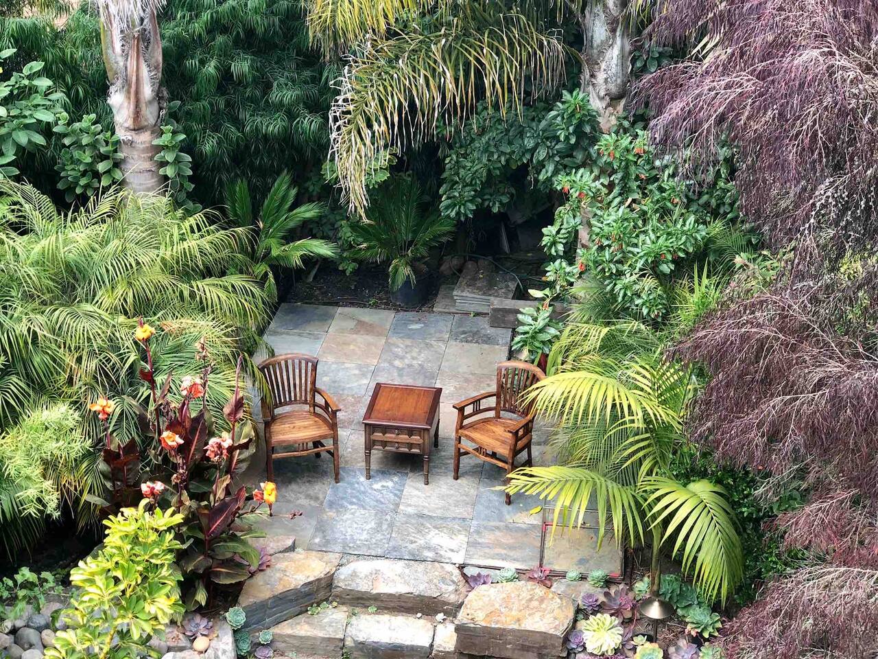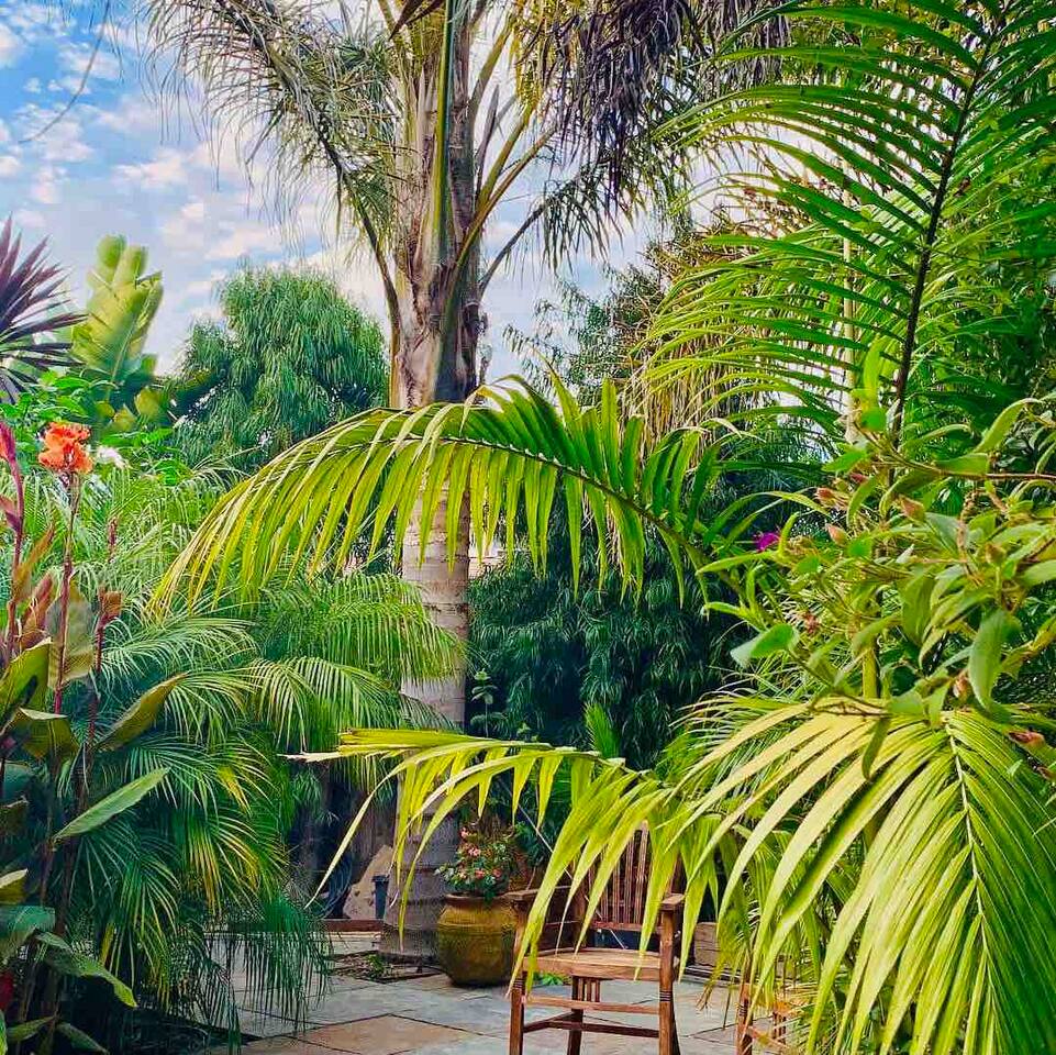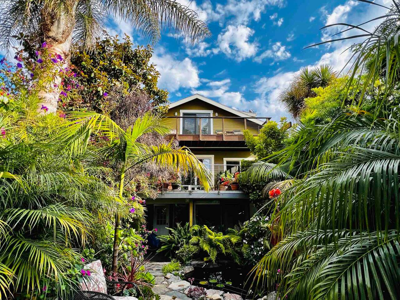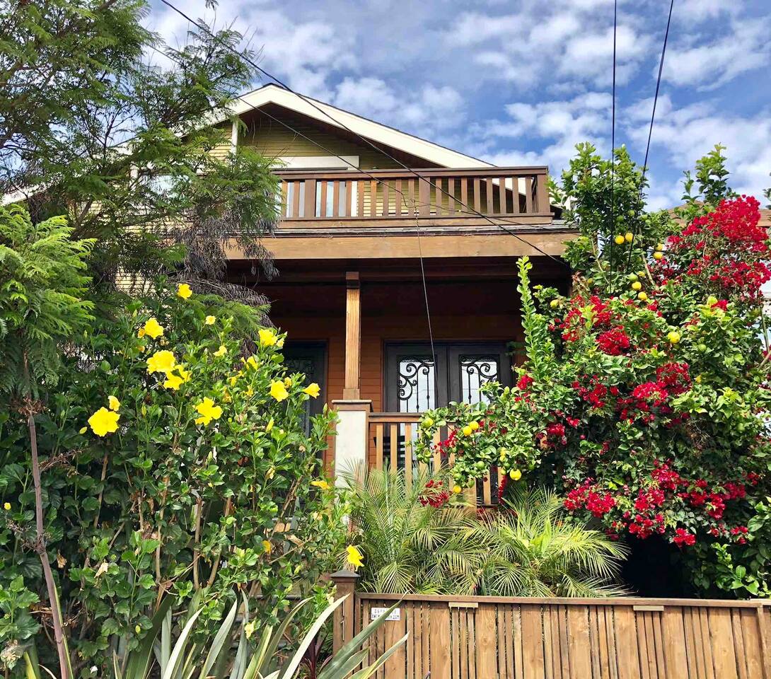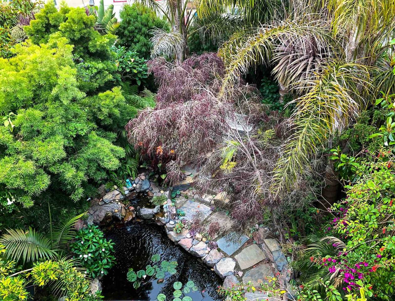 IMPORTANT: Must be able to climb stairs! Guest have access to: ~ 1 bedroom apartment with a separate entrance ~ 1 Italian white leather King bed with a brand new luxury King Tuft and Needle mattress in a open floor plan setting ~ full kitchen with custom built natural stone countertops with induction stove, refrigerator, toaster, Nespresso machine ~ Italian design built-in microwave and oven ~ new custom built bathroom with double sink, a rain shower and a Toto floating water efficient toilet with a built-in washlet bidet seat ~ desk area ~ dining table with 4 chairs ~ living room with 75" Samsung 3D Smart TV; ~ front terrace with seating area overlooking the street ~ back terrace overlooking the lush backyard and koi fish pond ~ laundry ~ lush gardens with koi fish and water Lilly pond ~ MUST BE ABLE to climb stairs, preferably traveling light ( small carry-on is ideal )
