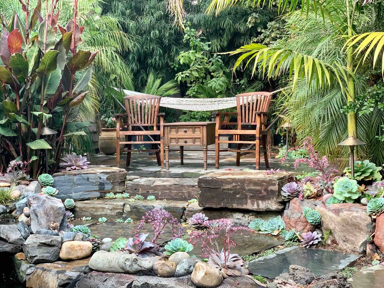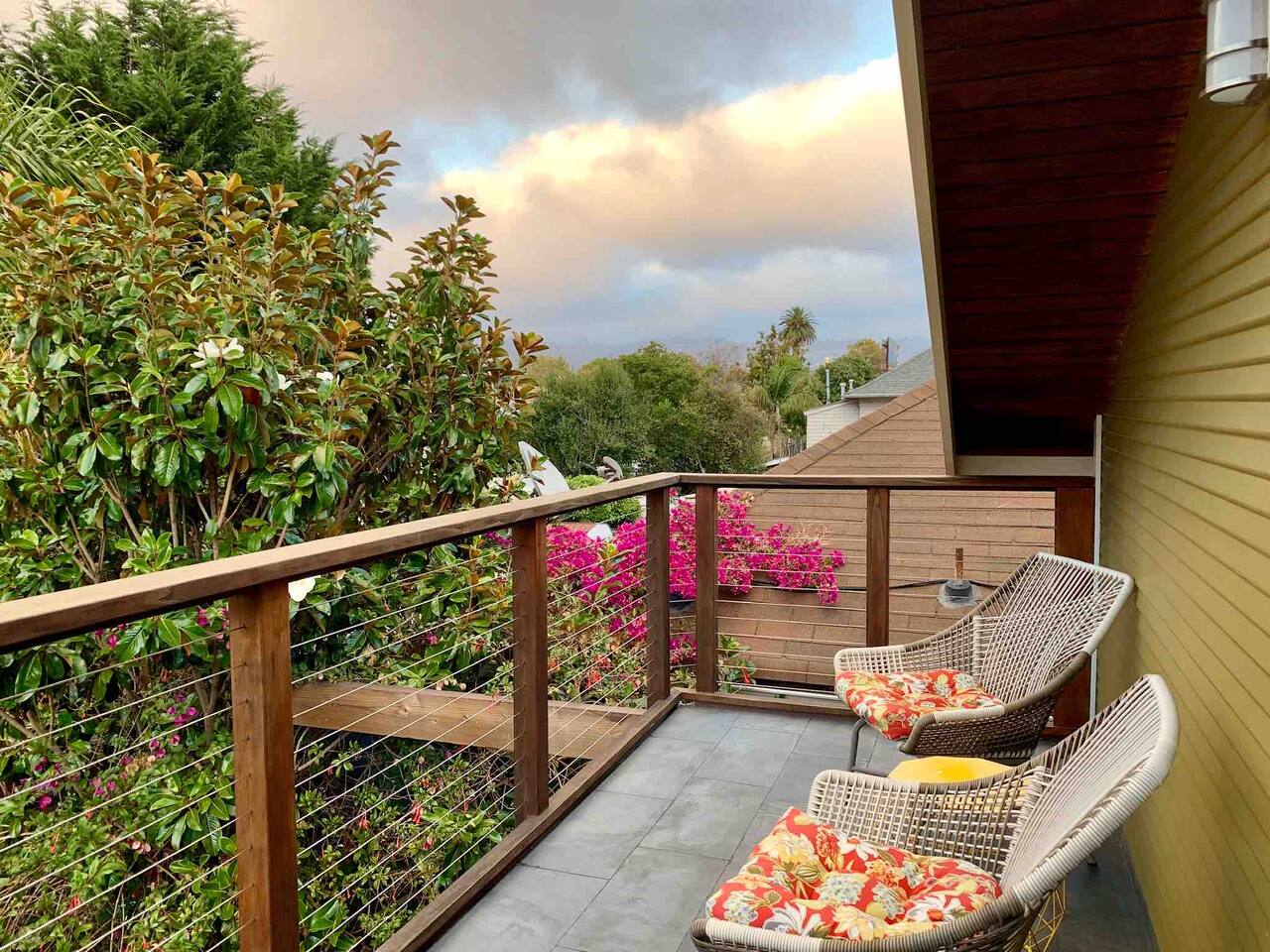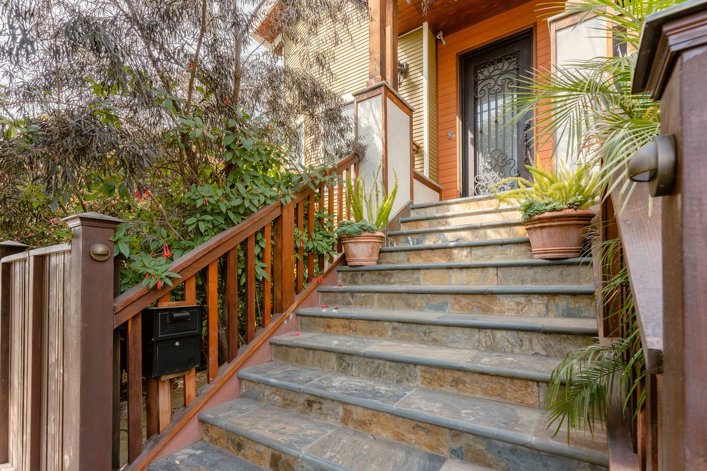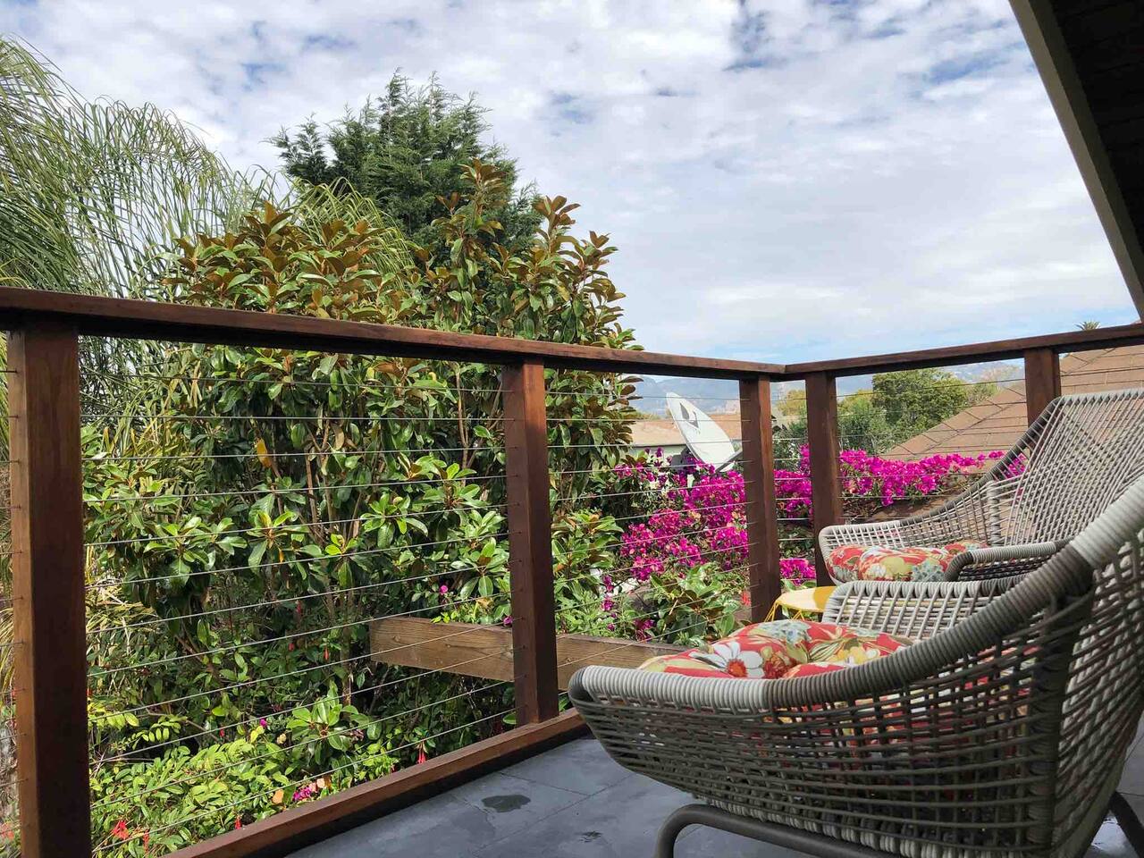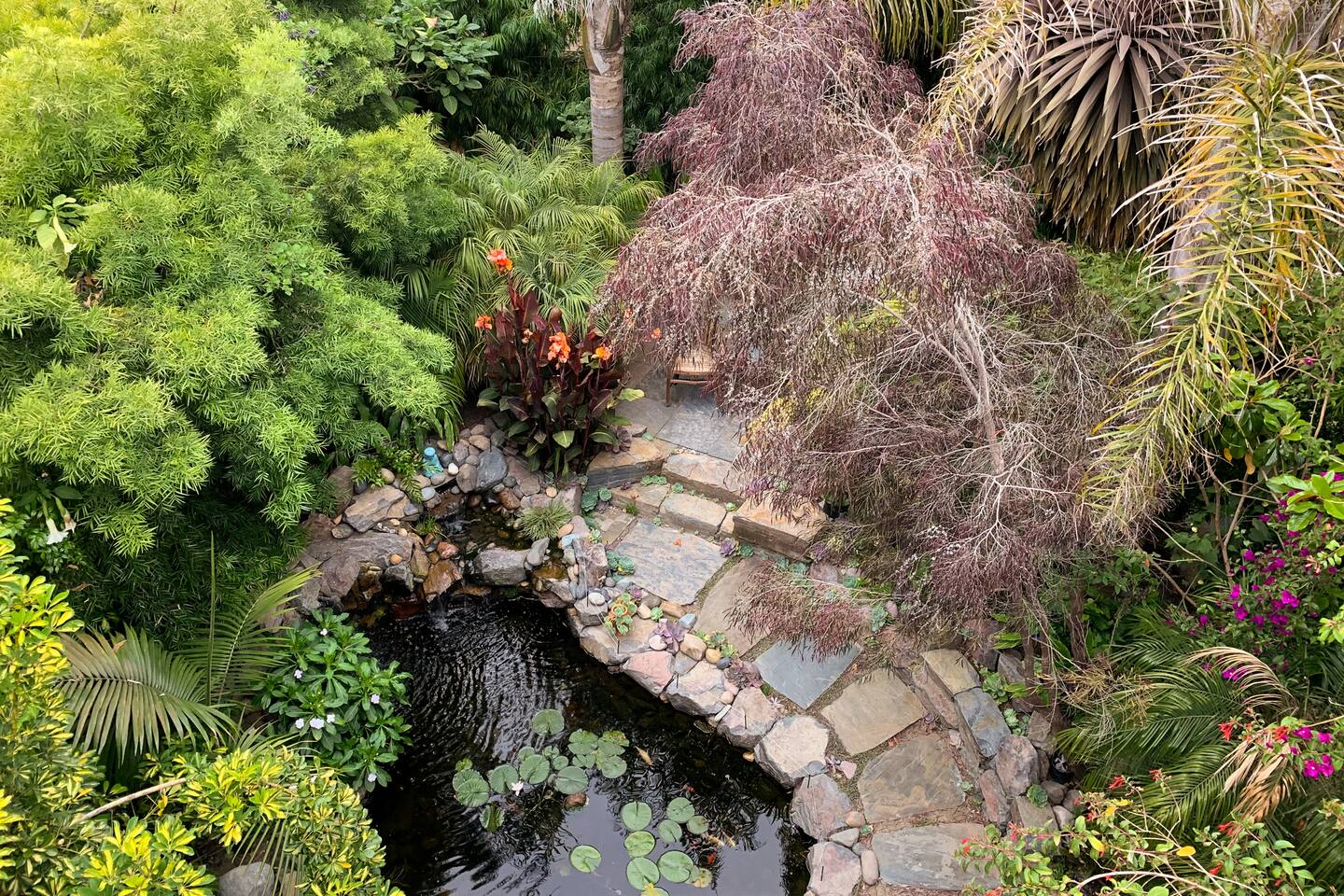 IMPORTANT: Must be able to climb stairs! Guest have access to: ~ 1 bedroom apartment with a separate entrance ~ 1 Italian white leather King bed with a brand new luxury King Tuft and Needle mattress in a open floor plan setting ~ full kitchen with custom built natural stone countertops with induction stove, refrigerator, toaster, Nespresso machine ~ Italian design built-in microwave and oven ~ new custom built bathroom with double sink, a rain shower and a Toto floating water efficient toilet with a built-in washlet bidet seat ~ desk area ~ dining table with 4 chairs ~ living room with 75" Samsung 3D Smart TV; ~ front terrace with seating area overlooking the street ~ back terrace overlooking the lush backyard and koi fish pond ~ laundry ~ lush gardens with koi fish and water Lilly pond ~ MUST BE ABLE to climb stairs, preferably traveling light ( small carry-on is ideal )