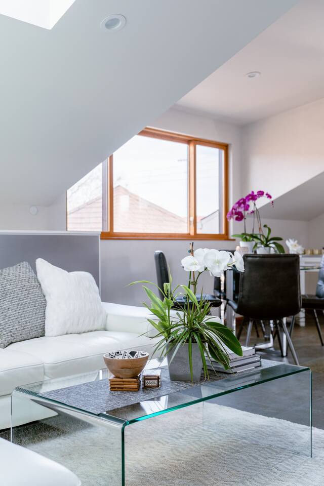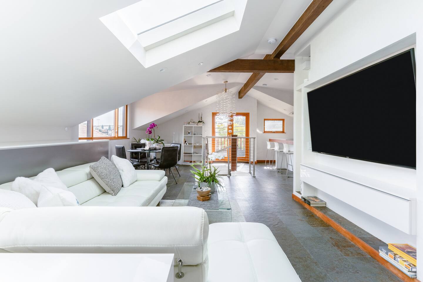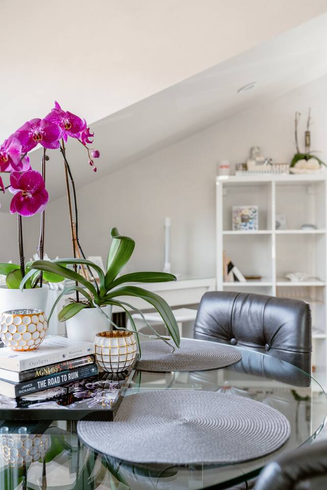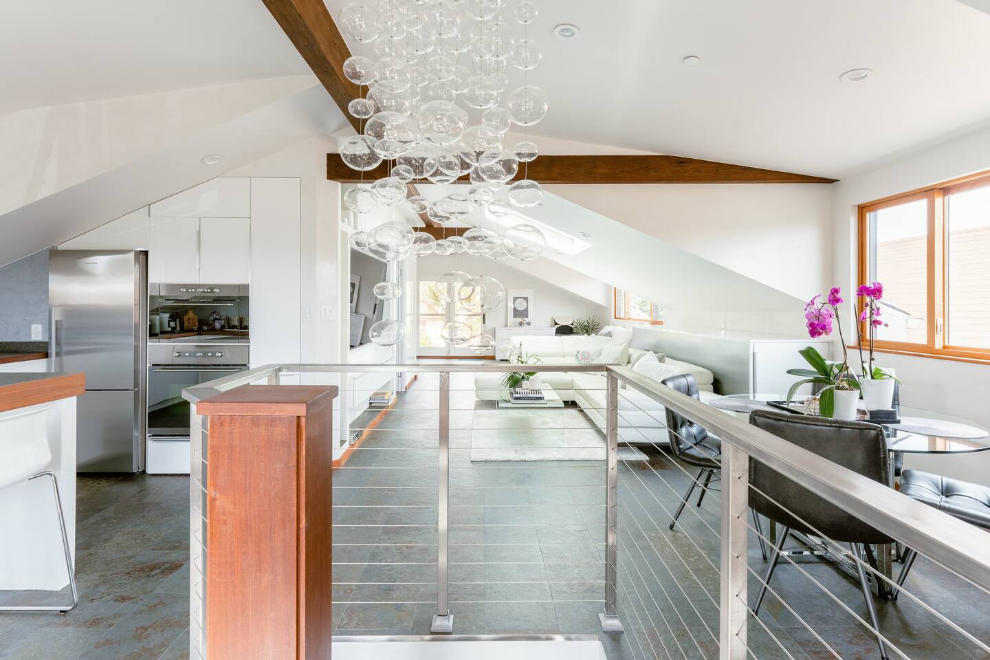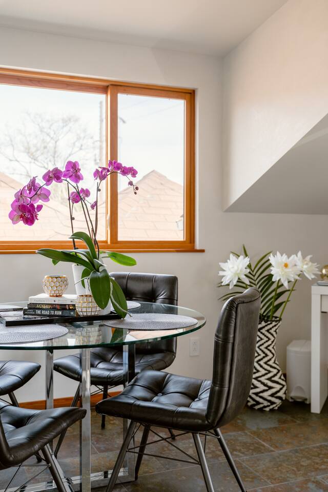 The STARGAZER – Spacious top-floor, modern, private, sunny, serene, and open-floor-plan Mansard apartment, situated atop our beautiful 125-year-old California Craftsman home. The perfect urban oasis, for business executives, writers, creators, and meditation retreats. It has its own SEPARATE, private entrance and a natural stone staircase ( MUST BE ABLE TO CLIMB STAIRS ) that leads to your own secluded sanctuary, with a luxury KING BED and lux cotton sheets. The space is contemporary, airy, open and sunny, with a plenty of outdoor seating area - two big terraces overlooking the lush gardens adorned with a koi fish water lily pond serving as a focal point. It’s close to Berkeley, Oakland and a short and beautiful drive to San Francisco via Bay Bridge. Why You’ll Love It: • Light-filled loft with an open floor plan, natural-stone staircase, 2 skylights for natural light and heated floors. • Plush Italian leather KING bed with luxury European cotton sheets for ultimate comfort • Minimalist, modern organic design, blending style and function for a comfortable living • Nestled amidst a lush tropical garden, The Stargazer offers two separate private terraces that provide breathtaking views. Savor your morning espresso or a glass of evening wine, while enjoying the resident hummingbirds feeding on flower nectar. The serene atmosphere is further enhanced by the koi fish water lily pond, creating the ultimate urban oasis. • FREE and easy street parking 🅿️ —a rare city perk! Our GUESTS: Perfect for business professionals, couples, or solo travelers seeking a peaceful retreat near Bay Bridge, just across San Francisco, 10 - 20 min away from PIXAR, UC Berkeley, Oakland downtown, Salesforce, Embarcadero, San Francisco downtown, Treasure Island, Berkeley Marina. BOOK NOW to experience this one-of-a-kind getaway! 🌿 🔻MAX OCCUPANCY at all times: 3 people ( Unless approved by us in writing beforehand ) We care for the planet and try reducing our carbon footprint and have implemented different green solutions throughout the design and built process. It has been all custom built and tastefully designed focusing on sustainable and eco-friendly practices - salvaging all the wood from the original house attic; • all the California Gold Natural stone was salvaged from a local shop that wanted to get rid of it; • installing radiant hydronic heat - a sustainable and very efficient way to heat the space and allergy friendly. • natural stone and bamboo floors; • 2 large skylights to maximize on natural light; • German engineered Resysta front siding - green and extremely durable material, resistant to sun, rain, frost and even salt water. It features open floor plan and a modern airy feel with preserving, yet enhancing all the original elements, bridging past and present. The design straddles the line between modern and traditional - with its open floor plan and clean lines along with natural stone, white Venetian plaster throughout & custom built , hand - crafted reclaimed wood elements. It’s designed as a modern tree house and flooded with natural light - get lost in the greenery and the serenity of the palm trees, flowering bougainvillea, lemon trees and being surrounded by hummingbirds bathing in the koi fish pond. The lush gardens and the water Lilly koi fish pond in the backyard, create a tranquil sanctuary with a feeling of an urban oasis. Sip your coffee and catch the sunset on one of our two roof - top terraces — the front one is overlooking the street, the back one - overlooking the garden & koi fish pond and Berkeley hills. The house' beautiful Craftsman facade stands out on our tree-lined street. It has a welcoming feel with all the natural materials used and clean architectural lines. The California Gold natural stone staircase leads you to a covered porch with reclaimed redwood pillars and railings, salvaged from the original house built in 1910. The tall Craftsman French wrought-iron Gate is awaiting to welcome you in and the spiral staircase leads your way to the top! 🔻NOTE: 🔻Must be able to climb stairs! Inside, the entire 3rd floor of the house is a spacious one bedroom guest suite with an open and airy floor plan; slanted ceilings, open kitchen with stainless steel appliances and custom built gorgeous California Gold natural stone countertops; dining nook, king bed, office desk and a large custom built new bathroom with natural stone and rain shower, featuring a skylight inviting the sun-rays to paint rainbows overhead while you shower. It also features a spare room with plenty of storage. It features heated natural stone and bamboo hardwood floors throughout with hydronic radiant heating; All walls throughout the apartment are crafted with custom-made, 3 step-process hand-applied white Venetian plaster, complementing the clean modern lines bringing calm atmosphere and sophistication to our busy life. 2 skylights are providing glimpse into the sky and invite plenty of natural light. The hand crafted wood elements and the natural stone bring warmth and grounding. The custom-built, elegant, hand-made glass orbit chandelier which Albena custom built, suspends from the high ceiling over the natural stone spiral staircase, offering soft ambiance and serving as a focal point while playing with the light. 75" Samsung 3D Smart TV provides all that you might need in the Entertainment department - motion and voice-activated remote, wireless keyboard and Web browsing. Brand new Italian design white leather sofa across the room provides a comfortable seating - watching TV or simply relaxing. Off-street Parking is plenty and free on our tree-lined, park-like street. We are just across from the new Emeryville Center of Community Life ( ECCL ) and school with community outdoor pool and aquatics programs, walking distance to Pixar and all the bio-tech business Hollis corridor. Please NOTE🌿: NO blinds/ shades anywhere but behind the KING bed For esthetic purpose