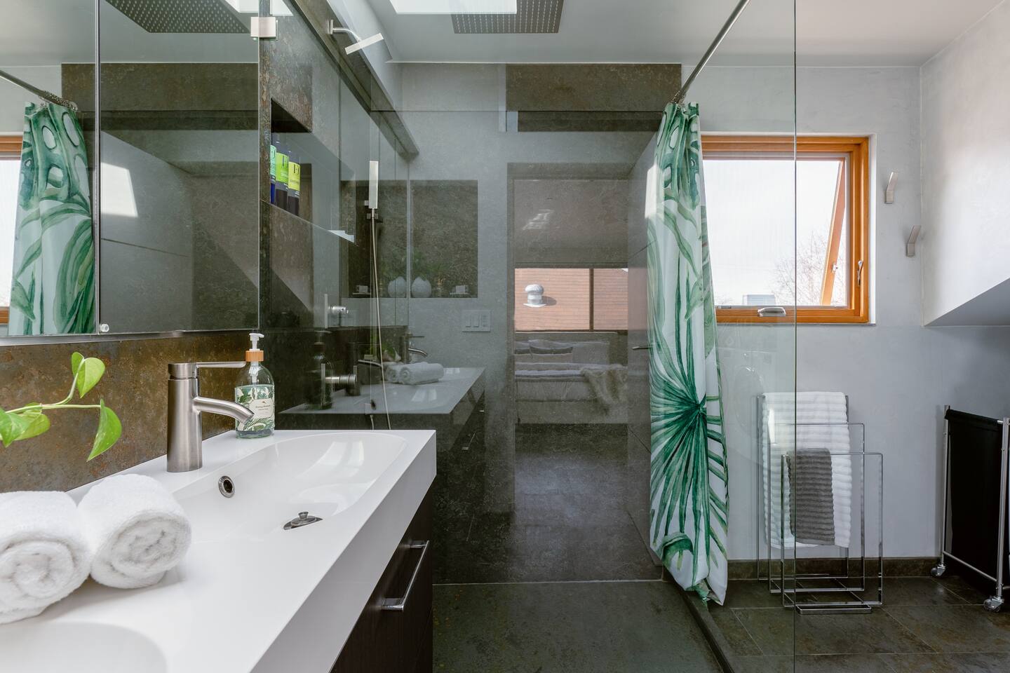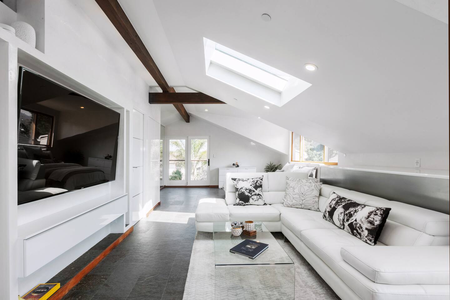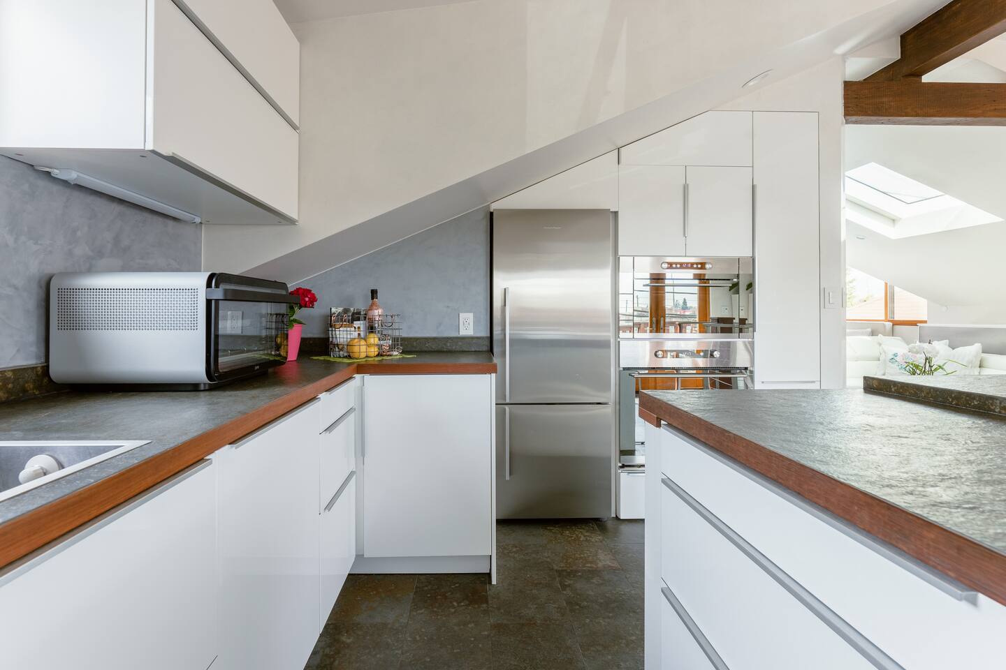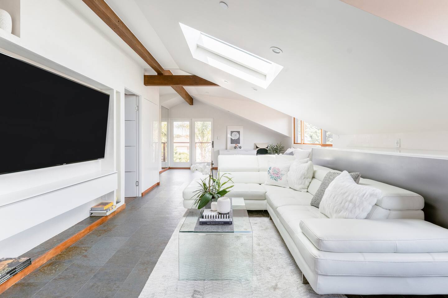 The STARGAZER – Spacious top-floor, modern, private, sunny, serene, and open-floor-plan Mansard apartment, situated atop our beautiful 125-year-old California Craftsman home. The perfect urban oasis, for business executives, writers, creators, and meditation retreats. It has its own SEPARATE, private entrance and a natural stone staircase ( MUST BE ABLE TO CLIMB STAIRS ) that leads to your own secluded sanctuary, with a luxury KING BED and lux cotton sheets. The space is contemporary, airy, open and sunny, with a plenty of outdoor seating area - two big terraces overlooking the lush gardens adorned with a koi fish water lily pond serving as a focal point. It’s close to Berkeley, Oakland and a short and beautiful drive to San Francisco via Bay Bridge. Why You’ll Love It: • Light-filled loft with an open floor plan, natural-stone staircase, 2 skylights for natural light and heated floors. • Plush Italian leather KING bed with luxury European cotton sheets for ultimate comfort • Minimalist, modern organic design, blending style and function for a comfortable living • Nestled amidst a lush tropical garden, The Stargazer offers two separate private terraces that provide breathtaking views. Savor your morning espresso or a glass of evening wine, while enjoying the resident hummingbirds feeding on flower nectar. The serene atmosphere is further enhanced by the koi fish water lily pond, creating the ultimate urban oasis. • FREE and easy street parking 🅿️ —a rare city perk! Our GUESTS: Perfect for business professionals, couples, or solo travelers seeking a peaceful retreat near Bay Bridge, just across San Francisco, 10 - 20 min away from PIXAR, UC Berkeley, Oakland downtown, Salesforce, Embarcadero, San Francisco downtown, Treasure Island, Berkeley Marina. BOOK NOW to experience this one-of-a-kind getaway! 🌿 🔻MAX OCCUPANCY at all times: 3 people ( Unless approved by us in writing beforehand ) We care for the planet and try reducing our carbon footprint and have implemented different green solutions throughout the design and built process. It has been all custom built and tastefully designed focusing on sustainable and eco-friendly practices - salvaging all the wood from the original house attic; • all the California Gold Natural stone was salvaged from a local shop that wanted to get rid of it; • installing radiant hydronic heat - a sustainable and very efficient way to heat the space and allergy friendly. • natural stone and bamboo floors; • 2 large skylights to maximize on natural light; • German engineered Resysta front siding - green and extremely durable material, resistant to sun, rain, frost and even salt water. It features open floor plan and a modern airy feel with preserving, yet enhancing all the original elements, bridging past and present. The design straddles the line between modern and traditional - with its open floor plan and clean lines along with natural stone, white Venetian plaster throughout & custom built , hand - crafted reclaimed wood elements. It’s designed as a modern tree house and flooded with natural light - get lost in the greenery and the serenity of the palm trees, flowering bougainvillea, lemon trees and being surrounded by hummingbirds bathing in the koi fish pond. The lush gardens and the water Lilly koi fish pond in the backyard, create a tranquil sanctuary with a feeling of an urban oasis. Sip your coffee and catch the sunset on one of our two roof - top terraces — the front one is overlooking the street, the back one - overlooking the garden & koi fish pond and Berkeley hills. The house' beautiful Craftsman facade stands out on our tree-lined street. It has a welcoming feel with all the natural materials used and clean architectural lines. The California Gold natural stone staircase leads you to a covered porch with reclaimed redwood pillars and railings, salvaged from the original house built in 1910. The tall Craftsman French wrought-iron Gate is awaiting to welcome you in and the spiral staircase leads your way to the top! 🔻NOTE: 🔻Must be able to climb stairs! Inside, the entire 3rd floor of the house is a spacious one bedroom guest suite with an open and airy floor plan; slanted ceilings, open kitchen with stainless steel appliances and custom built gorgeous California Gold natural stone countertops; dining nook, king bed, office desk and a large custom built new bathroom with natural stone and rain shower, featuring a skylight inviting the sun-rays to paint rainbows overhead while you shower. It also features a spare room with plenty of storage. It features heated natural stone and bamboo hardwood floors throughout with hydronic radiant heating; All walls throughout the apartment are crafted with custom-made, 3 step-process hand-applied white Venetian plaster, complementing the clean modern lines bringing calm atmosphere and sophistication to our busy life. 2 skylights are providing glimpse into the sky and invite plenty of natural light. The hand crafted wood elements and the natural stone bring warmth and grounding. The custom-built, elegant, hand-made glass orbit chandelier which Albena custom built, suspends from the high ceiling over the natural stone spiral staircase, offering soft ambiance and serving as a focal point while playing with the light. 75" Samsung 3D Smart TV provides all that you might need in the Entertainment department - motion and voice-activated remote, wireless keyboard and Web browsing. Brand new Italian design white leather sofa across the room provides a comfortable seating - watching TV or simply relaxing. Off-street Parking is plenty and free on our tree-lined, park-like street. We are just across from the new Emeryville Center of Community Life ( ECCL ) and school with community outdoor pool and aquatics programs, walking distance to Pixar and all the bio-tech business Hollis corridor. Please NOTE🌿: NO blinds/ shades anywhere but behind the KING bed For esthetic purpose