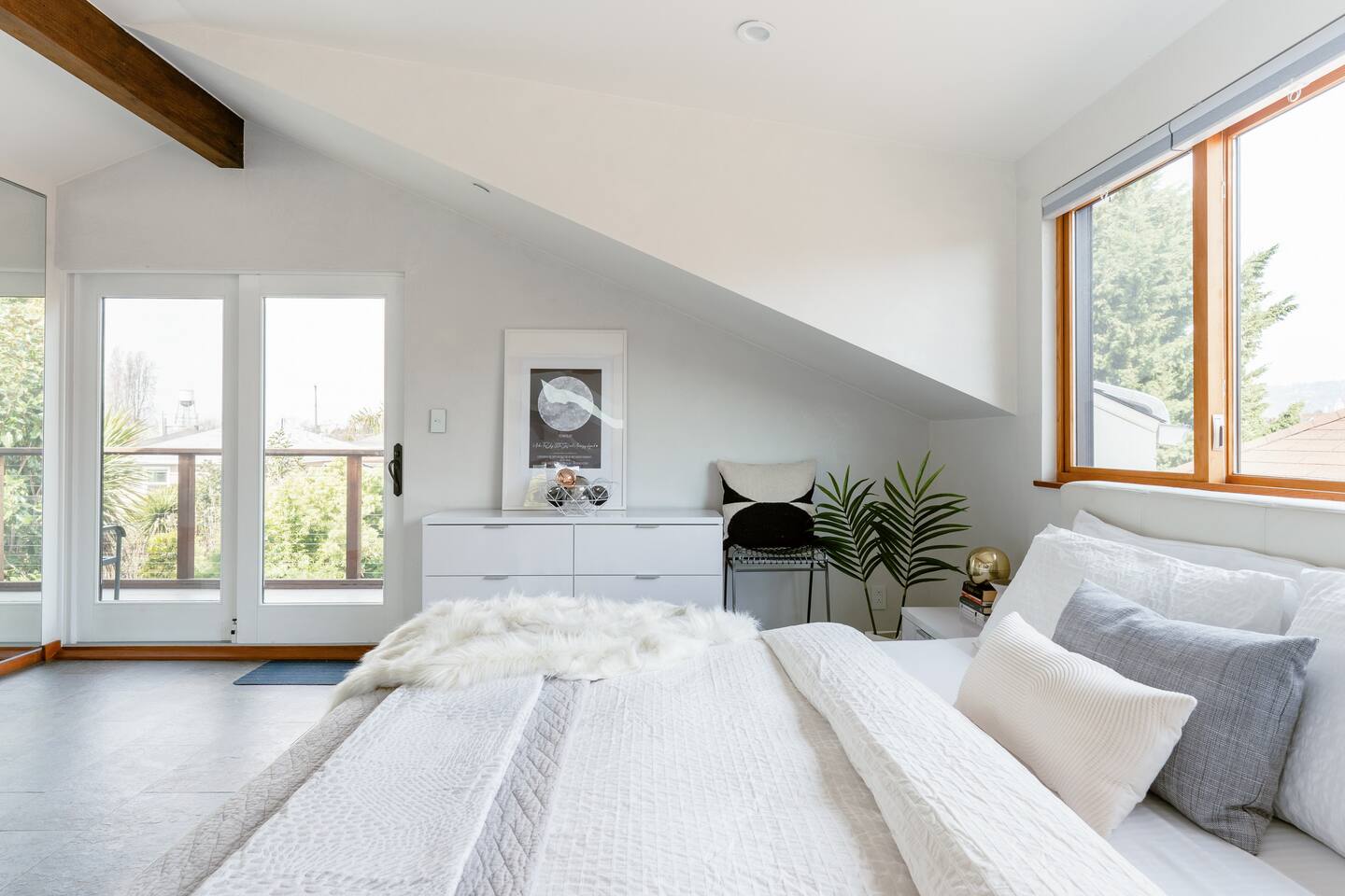 Escape the busy life - unwind in this modern urban oasis, nestled among greenery on top of our Craftsman The light-filled loft boasts an open floor plan, a natural-stone staircase, a heated floor, and a lux KING BED Read a book in the hammock under the palm trees, watch the birds bathe in the koi pond, catch the sunset from one of the terraces Experience the serenity of the minimalist, organic architecture, designed with comfort in mind SF, Berkeley, Oakland - 10 - 20 min away FREE PARKING!